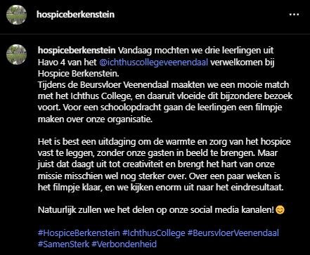 Wij hebben als groepje het Hospice Berkenstein in Veenendaal uitgekozen. Toen moesten we daarover een marktonderzoek maken en ons voorbereiden voor volgende week; volgende week gaan we namelijk naar het Hospice toe voor de eerste keer.